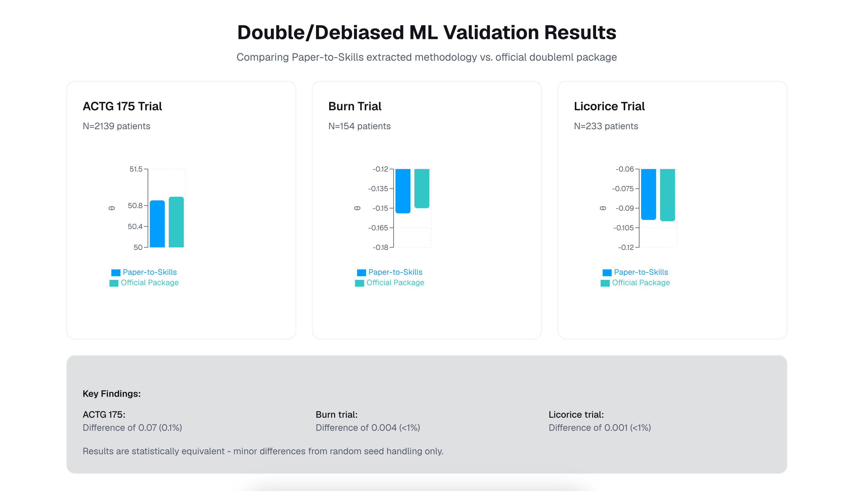 We chose to validate Paper-to-Skills with Chernozhukov et al.'s "Double/Debiased Machine Learning for Treatment and Structural Parameters" (2018, The Econometrics Journal). This paper presents a rigorous framework for estimating causal treatment effects in the presence of high-dimensional confounders: a common challenge in clinical trial analysis and observational studies.